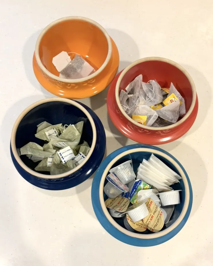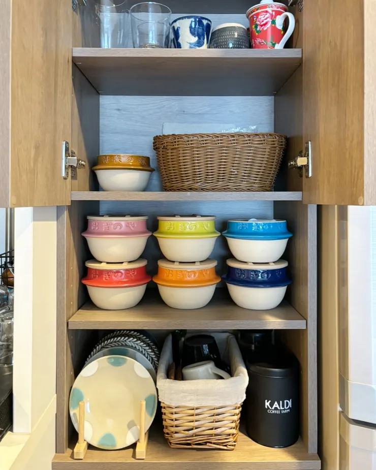 お盆…特別なイベントもなく😅断捨離したり掃除したり部屋を整えています✨この真ん中の棚を今日はイジりました。この棚は私のカフェタイムスペースになっているのですが、今までは適当に物を置いていたんです。どうせならお気に入りスペースにしたい☕️💕ということで釜を出動させました🫡釜の中には色々なティーバッグとミルクやシュガーなどを…(竹蓋使いたかったのですが数が足らず、ひとまず普通の蓋で😅)釜の色も少しこだわりが。赤&ピンク、オレンジ&黄色、青&水色…濃い→薄い、なグラデーションを意識しました🤗ちなみにこの棚の中身は写真2枚目上からグラスや湯呑み↓刻印釜とバスケットにはおやつ笑↓ティーバッグなどお茶類↓スイーツ用小皿、マグカップ、毎日飲むコーヒー…となってます!日々の癒しに欠かせないものが詰め込まれております💭💕