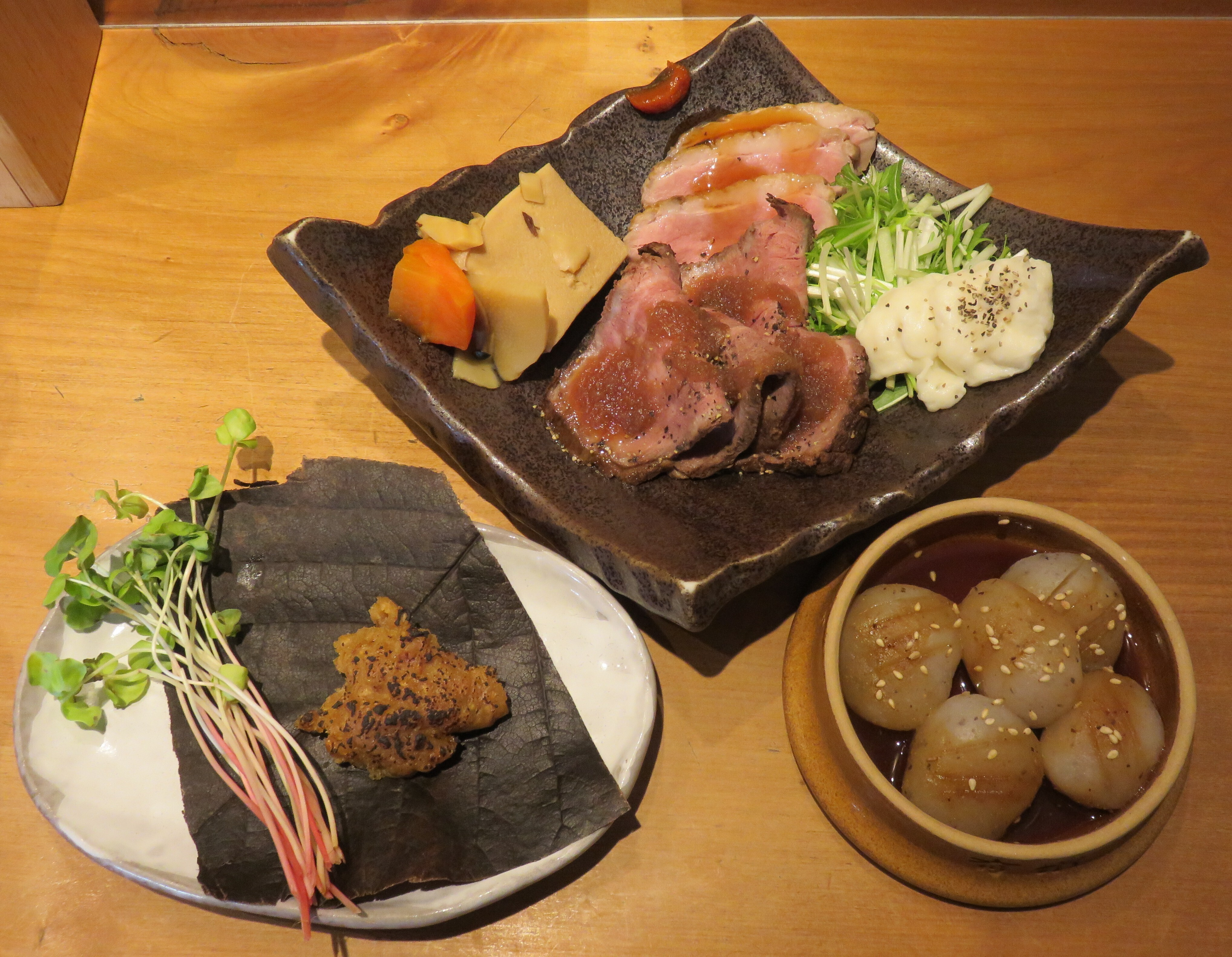 (高野豆腐の煮物・鴨ロースト・ローストビーフ・ポテトサラダ)