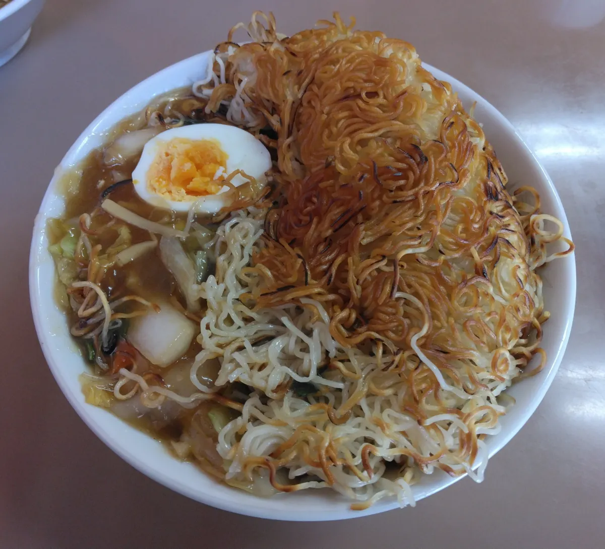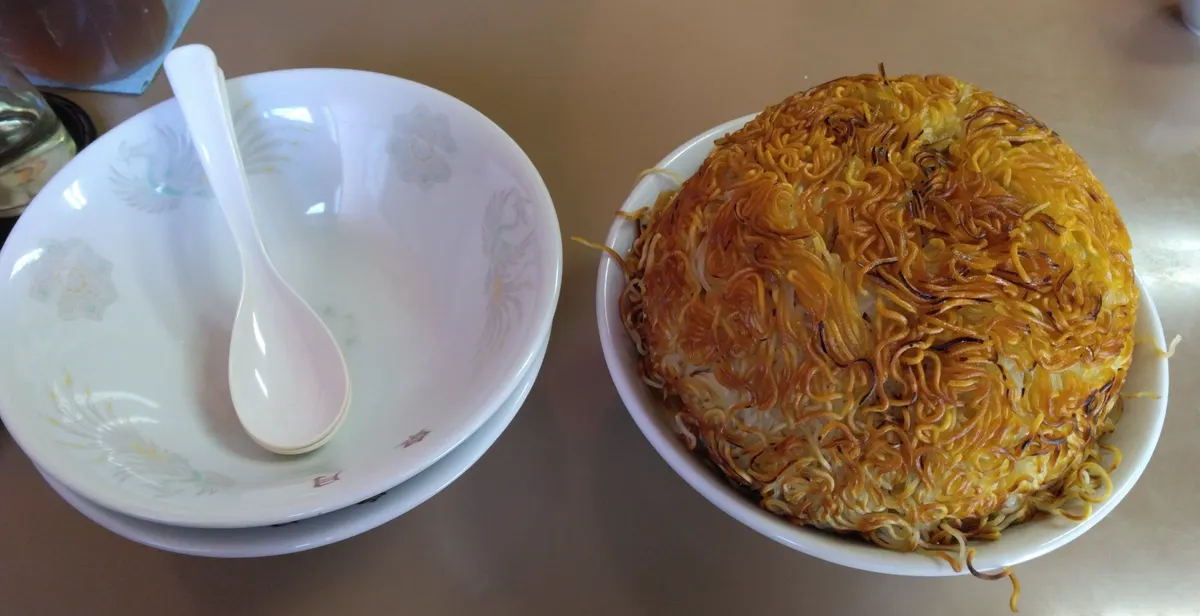 巨大な焼き麺が丼の上にドーム状に被っててインパクト大です✨