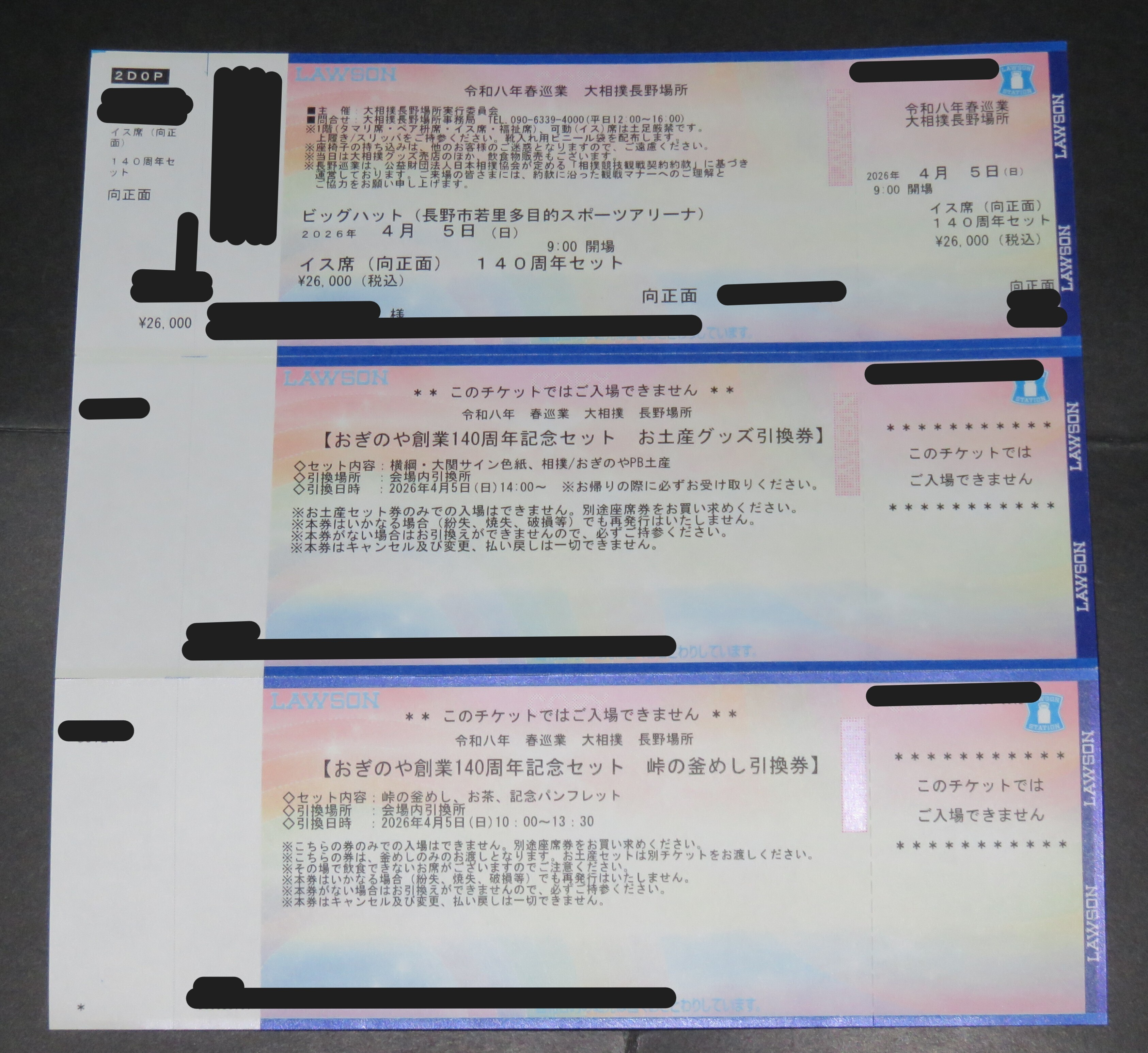 大相撲長野場所 春巡業のチケット+荻野屋創業140周年記念セット+交通費=💥😱💥