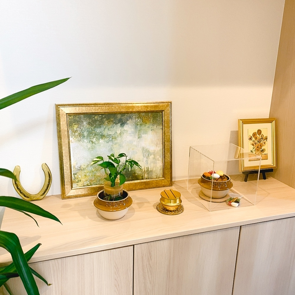 投稿を表示絵画をバックに、ゴールド系とグリーンでまとまっていて素敵ですね😊 奥のゴッホ(日本好き)も喜んでそう🌻