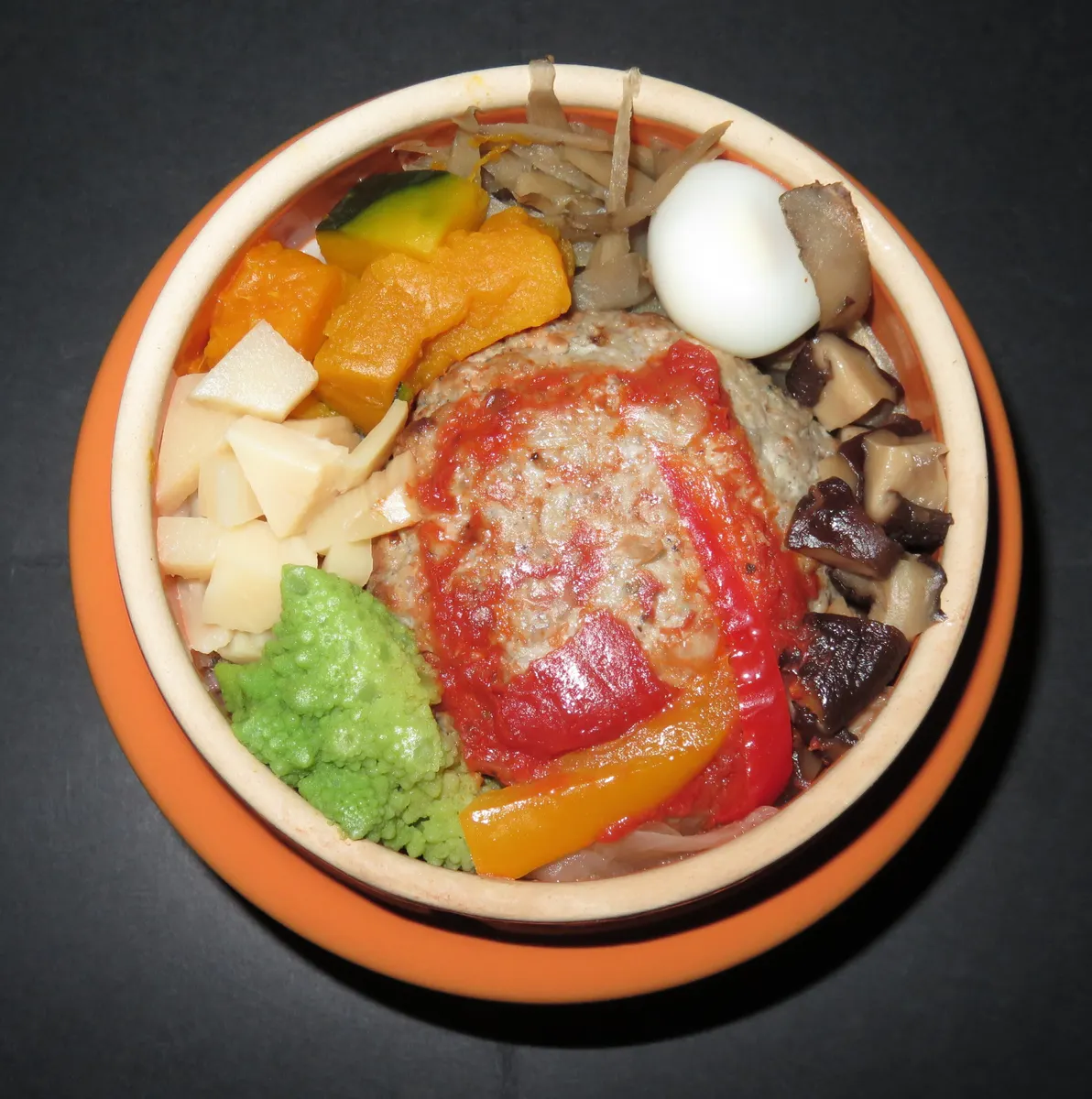 投稿を表示ハンバーグがけっこう大きいんですね❣️ たけのこと椎茸とごぼうが脇を固めているのが、ちょっとおもしろいです😄