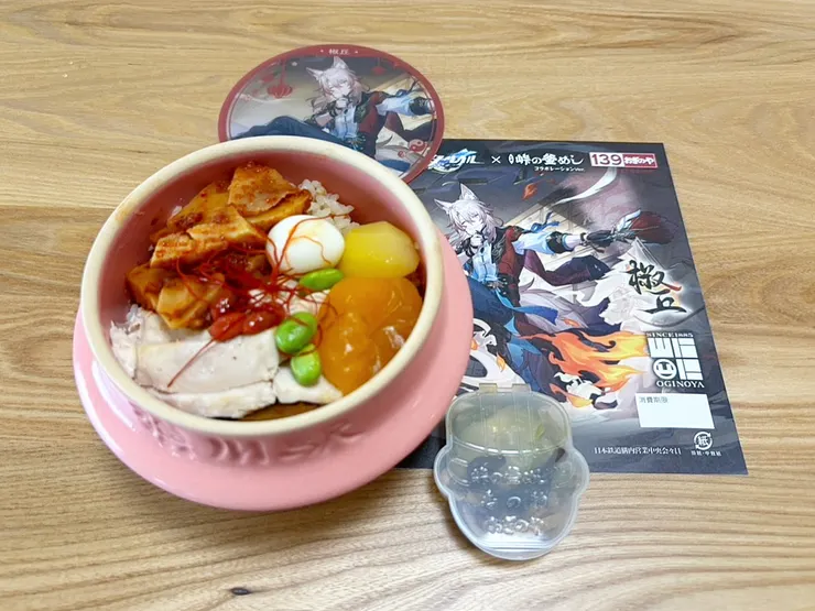先程コラボ釜めしが届き、早速ピンクの方をいただきました🩷具材は蒸し鶏、麻辣醤筍和え、麻辣醤ごぼう和え、茹でうずら卵、栗甘露煮、杏子甘煮、むき枝豆、糸唐辛子、クコの実。付け合わせ(香の物)は味付ザーサイ、子持ちきくらげ。でした!麻辣醤とは?辛そうなイメージしかなく、調べたところ唐辛子の辛さ+花椒の痺れる辛さの調味料らしく、確かに舌が痺れるような辛さでした🔥辛いのが苦手な方やお子様には結構辛いかもしれません。私は辛いもの好きですが、それでもなかなか辛く感じました!蒸し鶏には味付は無い感じで、シンプルに蒸した鶏肉、という感じです。筍とごぼうが味付も濃くて辛味もあるのでこちらでごはんが進みました!特典のコースターとポストカード、コースターは釜めしの蓋と同じサイズでしたよ😊ポストカードはダブり無しでした😊掛け紙は綺麗なものが別で入ってます✨ゲームやキャラクターは全くわかりませんが笑、大事にとっておきます😂明日、オレンジの方を食べてみます〜🧡