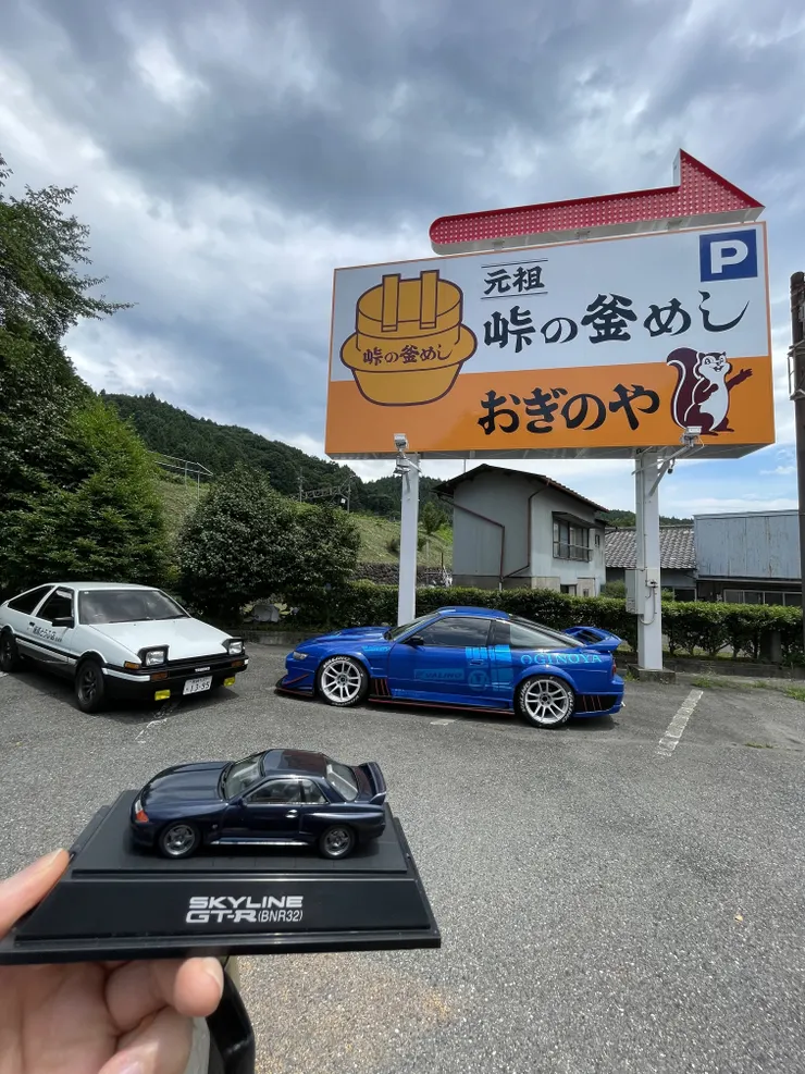 ドライブインの看板の下では、真子・沙雪のシルエイティと新たに並んだ拓海のAE86と一緒に愛車のミニカーのトリプルショットを撮影しました!いつか実車で訪問したいなぁ☺️