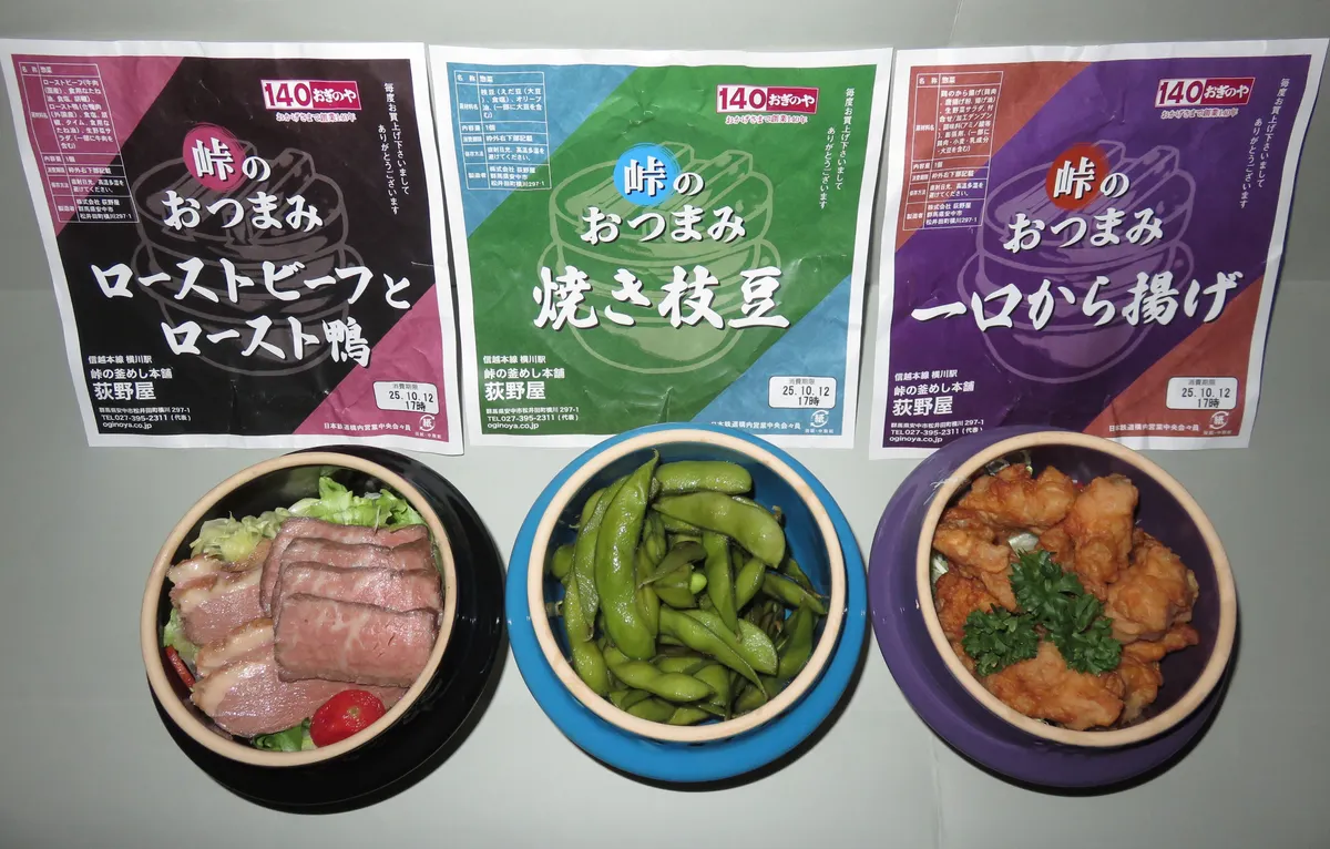 「おつまみ釜めし」の掛け紙は、それぞれの釜の色と合わせていて素敵なデザインですね😍