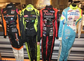 SAYA CAFE 久々にSAYA CAFE☕に来ました。 カウンターにはレーシングスーツが4着も飾られている🌟万が一の事💥が起きた時の為に、名前の隣に血液型が大きく印刷されてるのね💦 これ、展示用のレプリカかな?まさか、本人が使用した本物とか? それにしても、流石プロ!スポンサーの数が凄