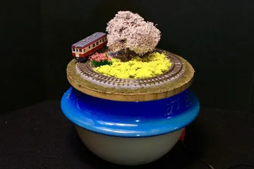 釜めしの釜の再利用で、竹蓋の上にジオラマを作ってみました。第一弾は地元の「房総の春」をテーマに、海をイメージした青いトーマス釜で、菜の花と桜の情景です。第二弾で、「上州の秋」で作ろうかと妄想中です。碓氷峠のイメージが再現できると良いのですが・・。