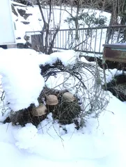 家族3人分の峠の釜めしの器。冬の庭にて。秋にお土産で買い、使い終わった器をプランターにして飾っていました。冬に雪が降った時、奇跡的に潅木が屋根になって守られていました。まるで一つの家のような温かみを感じました。秋に家族で温かく食べた思い出が、冬に暖かく蘇りました。ありがとうございます。