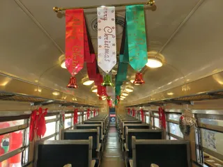 冬仕様 真岡駅の横にあるSLキューロク館で展示されているの列車の内部がXmas仕様にデコレーション✨ 1954年に北海道用として27台製造されて、1987年まで雪の大地を走り抜けた車両の1台🚋天井のライトと網棚・ボックス席に懐かしみを感じます🤣 正面から見ると・・・意外とシンプルな飾り付