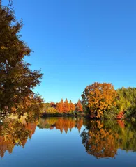静かな水面に紅葉がふわっと映ってて空を見上げたら、ぽつんと月が…こんな景色に偶然出会えると、心がふわっと軽くなります💛雲ひとつないとっても綺麗な秋空でした🍂✨