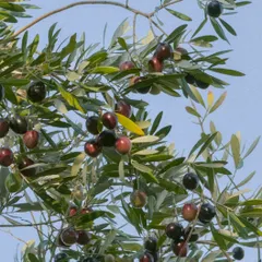 オリーブと秋の空 色づいたオリーブ。まさに実りの秋といったところでしょうか。快晴の秋空をバックに美味しそうに輝いています。実際はそのままでは渋すぎて食べることはできませんが、美味しいピクルスやオリーブオイラになってくれます様に…