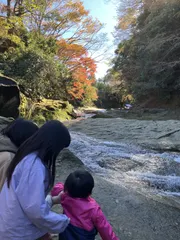 滝と紅葉と青空 やっと紅葉が見頃になりまして滝を見に行ってきましたタキ(ง ˘꒳˘ )วタキ🍁快晴でタイミングもよき☀️ 急な坂と階段、岩の凸凹歩道を歩いて行かないとなのでなかなか子どもと行くには厳しかったのですが💦頑張って歩いていました🚶♀️ 滝と紅葉で癒されました☺️
