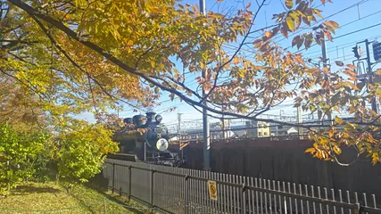 秋空と紅葉とSL(と新幹線) 京都鉄道博物館(梅小路公園)にて撮影。快晴の秋空と紅葉とSL8620形8630号機(大正時代製造の110歳)、奥には東海道新幹線も通りました!