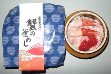 クリスマスに釜めし 自分へのクリスマスプレゼント🎁を購入する為、「新宿高島屋」に行って来ました。もちろん「東京季譚 蟹の釜めし」✨ 敷き紙は青色でカッコいい。中身も白とオレンジ色で縁起が良さそうな色彩でステキ。青系とオレンジ系で反対色だから、印象が更に強く感じますね👍 蟹🦀と筋子だけのシンプルな中身