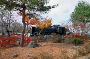 秋の中のポニー(C56 144) 35年間小海線で活躍したC56144は大切に展示保管され観光客の眼を楽しませています。色づいた木々の色とポニーの漆黒がとても印象的でした。