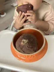 秋といえば焼きいも🍠🍂 秋といえばサツマイモ、サツマイモといえば焼きいもですね🍠🍂泣き止まない息子に焼きいもあげたのですが効果なしで🥲、試しに釜に入れてあげたら泣き止んで食べでいました。泣き疲れたのもあったのでしょうけどお釜に大感謝✨オレンジ釜がお気に入りのようです☺️
