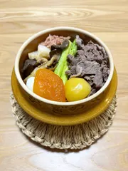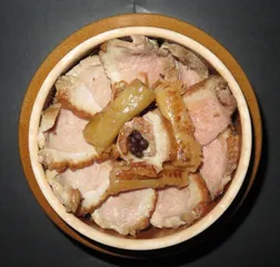 夢の釜めし 荻野屋さんの鴨肉🦆が好き過ぎて・・・🌟峠の一品鴨めし🌟を作りました。 釜めし2個分を使用した鴨肉は贅沢に10枚🤩鴨肉でぐるっと一周して中央に鴨肉で作ったお花。 バラの花🌹をイメージしたけど、肉で花を作るのは意外と難しいんですね💦上手く花びらが開かなかったです😨 掛け紙も