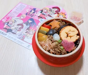 星の輝き釜めし💫 名入れ釜が届くまで釜めしは楽しみにとっておこうと思ってましたが、好きな作品とのコラボだったので買いました。推しが載ってる掛け紙が欲しかったので、星の輝き釜めしを食べました☺️彩りが綺麗で可愛い…!イカ墨ご飯や伊達巻が釜めしに入っているのが新鮮で、とても美味しかったです😋💕