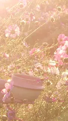 釜とコスモス 朝日と逆光のお陰でなんだか懐かしい感じに撮れたコスモスとピンク釜。