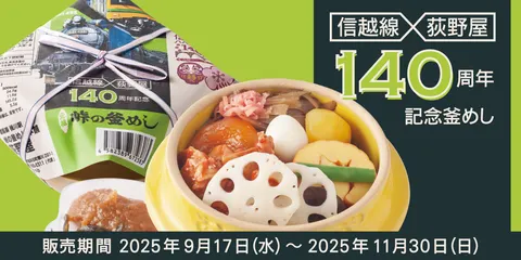 信越線開業・荻野屋創業140周年記念釜めし販売のお知らせ 2025年9月17日(水)より信越線開業と荻野屋の創業140周年を記念し、コラボ釜めしを販売しております。今年デビューしたGVとSLをイメージした具材を詰め込んだ特別仕様の釜めしです。皆様のご利用を心よりお待ちしております。・商品名:「信越線開業・荻野屋創業140周年記念釜めし 」・販売価格:1,8