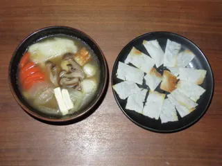 今日は雪が降って寒い🥶こういう時は温まる お雑煮を。 おかずは・・・餅スライサーでスライスして焼いた、お餅の薄焼きパリパリ煎餅🍘お餅が主食で、副食もお餅。 お餅が4個分の炭水化物定食です🤣もちろん、サラダもありますよ💦 1mm以下にスライスしたお餅の焼く前。お餅も手作り