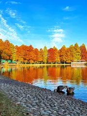 秋の公園⛲️🍂 足立区の舎人公園です⛲️きっとメタセコイアかな?綺麗に色付いてました🍂🧡カルガモさんも気持ち良さそうに泳いでました☺️