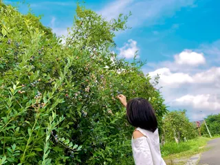 ブルーベリー狩り。暑くてやりたくないというなか無理やり連れて行きました🤣 スマホむけたらサボらずブルーベリー🫐とるように言われました🤣