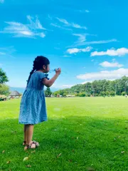 晴れた日の信州は、🈳の青🔵と緑💚 のコントラストが良いですネ🥰✨ 空の青と娘さんの青そして緑地の グリーンがとっても鮮やかで素敵です👏