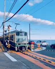 江ノ電 スラムダンクで有名な例の踏切を通ったので、記念に1枚。 空と電車の色合いがまた素敵な感じになった気がします!