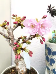 旭山桜🌸 鉢植えのミニ桜が開花しました。週末は天気が荒れるようなので室内に避難させつつ、リビングでお花見しようかな。