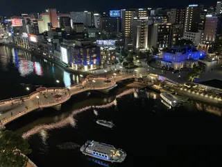 博多の夜 仕事場の飲みで、ビアガーデン🍻的な所で飲みたいねー。ということで、中洲のビアテラスからの眺めです。有名なであい橋が見下ろせました。また、リバークルーズ船も見え綺麗でした🌃