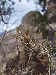 標高830mのヤマツツジの芽吹 標高800mを超える神社の参道の脇にヤマツツジが芽吹いていました。周りはまだ雪が残っていました。