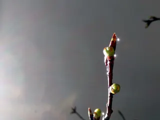 雨に濡れた桜の蕾が朝日を浴びて光っている様は清々しい感じがしました。