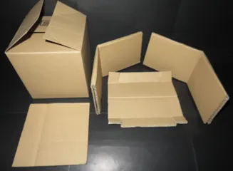 ここにあるのは15cm四方の立方体の段ボール箱。パーツ別にカットした段ボール。 底に140mm×140mmの段ボールを敷いて。【写真左】220mm×266mmの段ボールを、横に折ってからL字に折って箱の角にセット。【写真右】170mm×170mmの段ボールに切り込みを入れた物(上)のを組み