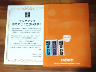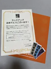 私も昨日届きました💕レターパックにての発送🎁そして、賞状のようなランクアップお知らせ✨おぎのわのクリアファイル🧡千手札シールは3色セット✨ こんなにしてもらえるとは🥹本当に嬉しかったです💖大切にします✨