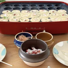 おうちでたこ焼き🐙 おうちでたこ焼きしました🐙トッピングの鰹節や青のりはミニ釜にちょうど良いです👍🏼タコは中間釜に入ってます。2人だとこのサイズでちょうど良いですが、大家族だと普通釜ですかね😊(取り皿は釜皿だと小さいので別のものですが、こちらはつかもとさんのお皿です😆)