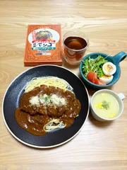 シャンゴのパスタソース🍝 先日横川店で購入したシャンゴのパスタソースを食べてみました🍝ちゃんととんかつも揚げましたよ🐷👍🏼デミグラスベースのミートソースでとっても濃厚!甘めで、八丁味噌か何か味噌系使ってるのかな?という印象を受けたのですが、販売元の商品紹介ページで"八丁味噌のような芳醇と甘さを感じるが味噌は一切使用してない"