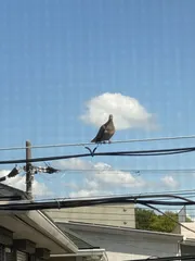 真夏の青空を背景に、なぜかこちらを全力でガン見してくるハト。 青空と雲の爽やかさとは裏腹に、その視線は妙に圧が強い…👀 なんとも言えない不思議な存在感でした🕊️